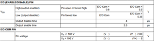 E/D管脚电压在 E/D Com + 0.8V  ~  E/D Com + 5.5V范围内时是使能输出;在E/D Com  ~ E/D Com + 0.35V是低电平,禁用输出。