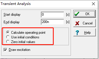 calculate operating point, use initial conditions, zero initial values 分别是计算工作点,使用初始条件和 零初始值;