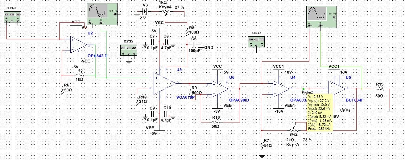 前几天比赛,做了一个宽带放大器,带宽10M,放大倍数100~~10000倍,信号输入是100mv以下,当时采取的方案是三级放大,前级用opa847放大10倍,中间级用可程控的vca810放大100倍,后即用ths3091在放大10倍,单独测试的时候,每个模块都正常,可是三级级联后,ths3091输出就自激了,感觉是我们祭炼出来问题,可是怎么也弄不出来,或许我们忽略了一些信号级联的基本的问题,请问:1、们的方案有没有错;2、信号间级联需要注意什么问题;3、还有我们用屏蔽线时会自激,但是示波器的线就不会,为什么;4、数据手册的电路图都有在输入端加对地50欧左右的匹配电阻,我们在信号级联时也要加对地50欧电阻吗?