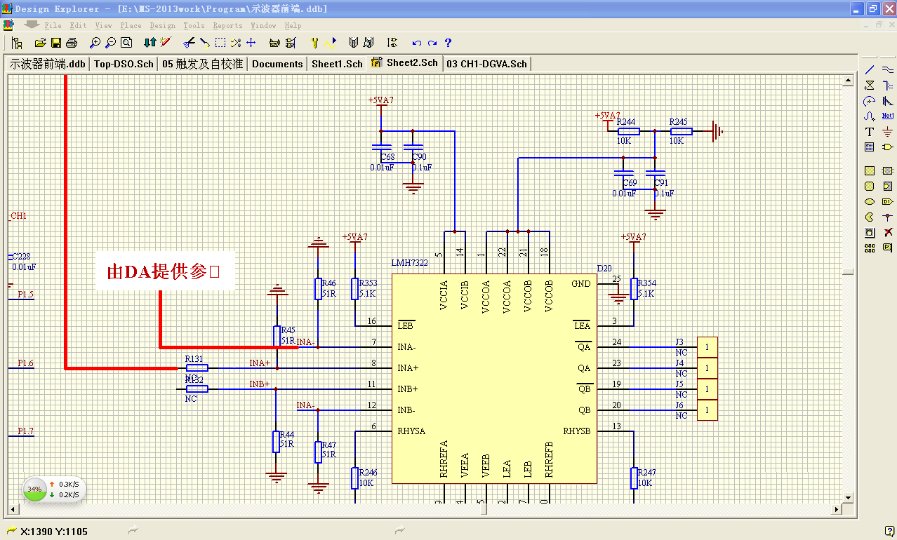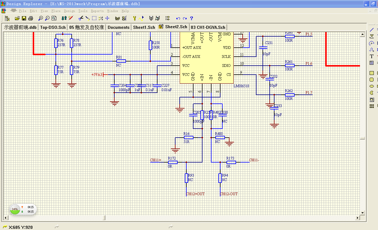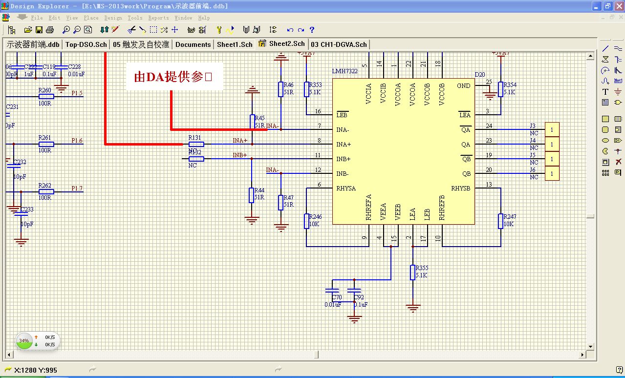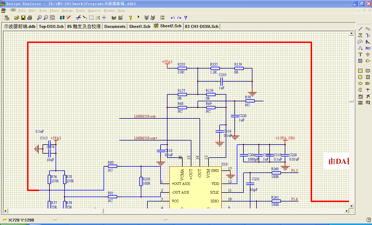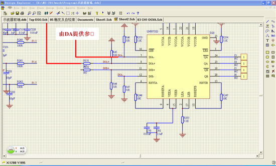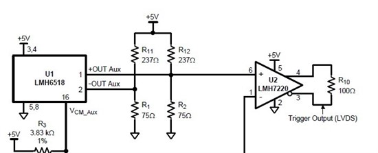 2)那些“上拉电阻和下拉电阻”是把输出的节点电压设置在1.2V左右。LMH6518的输出共模电压也是1.2V。这样连接时,没有大的直流电流流出/入 LMH6518。选值的另一个标准是上拉电阻和下拉电阻并联后的值跟PCB走线的阻抗(常用50欧姆)相匹配。