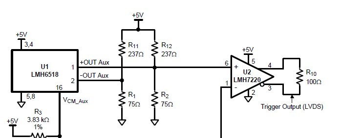 用LMH6518的AUX输出接TLV3502高速比较器做触发电路,DAC提供触发电平