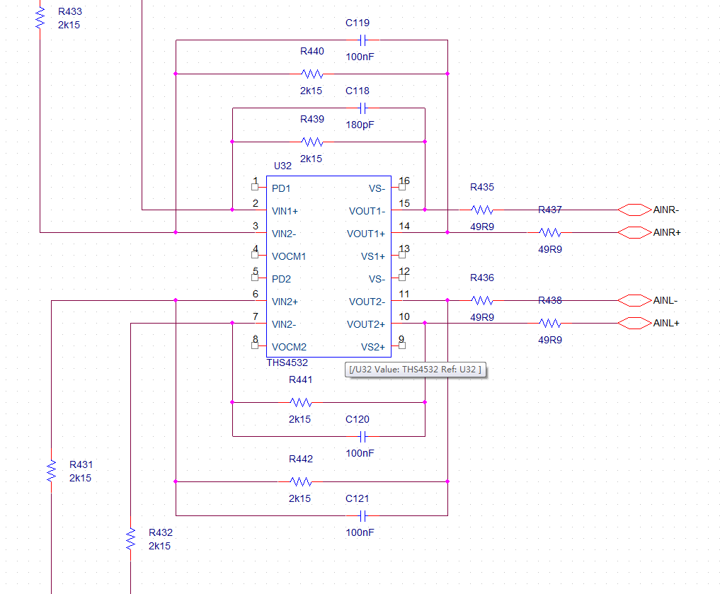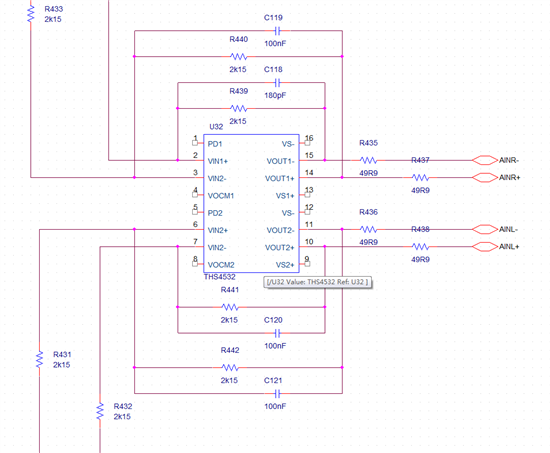 只画了一下信号端,有几个问题不太清楚,1:使用+5V单电源供电VS1+及VS2+两个引脚都需要加电吗?2:VOCM1/VOCM2需要两个都连接吗?codec芯片的VREF供电是5V,如果直接连入VOCM好像不太匹配。3:DAC之后的输出也想使用THS4532(使用全平衡输出),我直接做上低通滤波输出可行么?没太有经验,希望大家指点一二。
