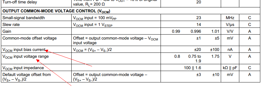 2. The output common-model voltage is set by the voltage at the VOCM pin and the internal circuit works to maintain the output common-mode voltage as close as possible to this voltage. If left unconnected, the output commonmode is set to mid-supply by internal circuitry, which may be over-driven from an external source.