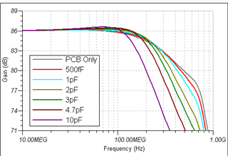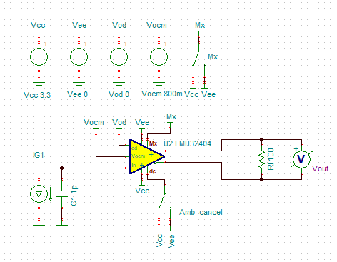 我前几天提出了LMH32404的Tina模型输出极性反了的问题,TI团队回复是模型错误,网表需要更改为G_G83 TIA20K MID I_IN N1634840 1 并且表示会尽快更新网站上的模型。 然而我今天重新下载了最新的模型,发现输出极性虽然正确了, 但是又引入了新的问题: 输入电流的大小及方向与跨阻增益的关系曲线,与datasheet中图6.21不符了,看来在修改输出极性的时候,这些地方的参数,也得做相应的变更, 请再次帮忙确认。 另外,最新的仿真电路,没有把输入电容设置为变量,在进行噪声和带宽分析的时候,就无法直接生成多个曲线对比的图表,类似下面图中的这种,不方便新用户的使用。
