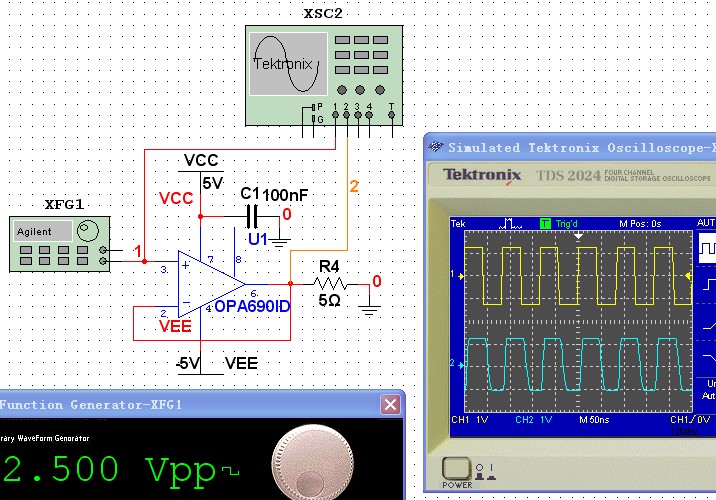 2. 另外一点请注意无论OPA690还是OPA842,在单位增益下注意增加一个25Ω的反馈电阻起到隔离和稳定的作用,这个在波特图下比较明显。