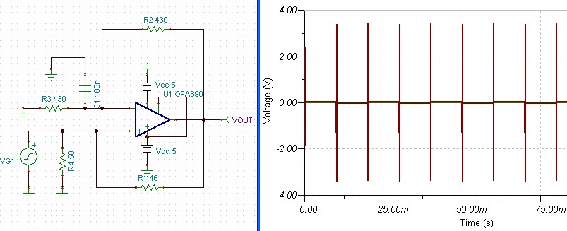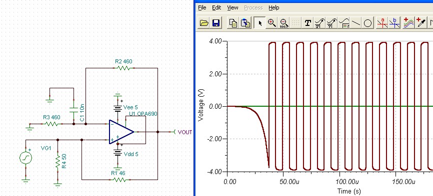 工程师您好:我用OPA690实现了一个负电阻电路,在没有任何输入的情况下,给负电阻电路提供正负5V的供电电压,发现输出端的电压一会是3.773V,一会又变为-3.821V,这是什么原因呢? 在电路中反馈电阻R=46Ω,