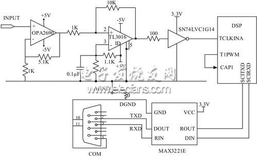 由于比较器在对低频正弦波信号进行整形时,输出波形的边沿有比较严重的抖动,影响测量。解决办法是对比较器加入正反馈,加速信号边沿,同时形成滞环,可有效消除抖动。整形后的信号经过高速施密特触发SN74LVC1G14进行限幅和进一步整形。