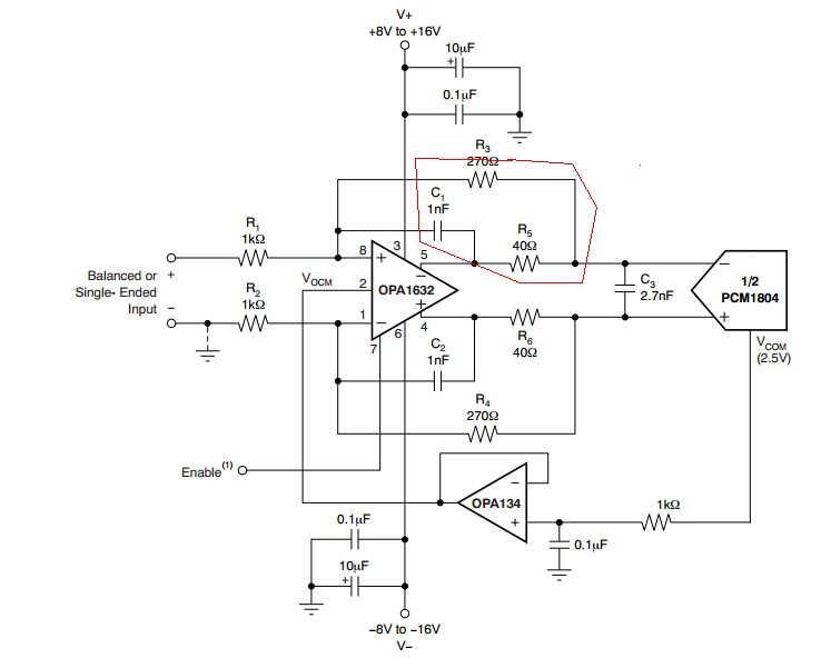 是用opa1632时,按照典型应用电路接的,但是,对于接法不是很理解,如opa1632手册 Figure11所示,对于其中的R5、R6、C3进行滤波这个说法,截止频率怎么计算? 还有,为什么要把R5、R6放到反馈电阻的里面,而C1、C2却放在直接接到运放的输出引脚上? 这样做有什么好处?