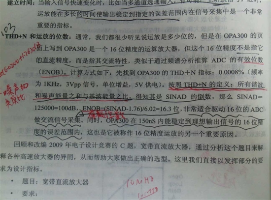 2. THD+N表示总谐波失真加噪声是0.0008%@ 1KHz,3Vpp输入,意思是说,当输入信号是1KHz的时候,运放对信号的失真(谐波+噪声)是0.0008%,则可以达到的SINAD就是1/0.0008%=125000,换算成对数就是100dB,然后换算成ENOB就是16.3位。另,OPA300手册第三页THD+N这个指标是0.003%,你那个资料上是不是写错了?