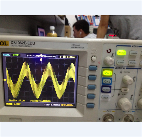 您好,我放大您的波形来看,没看错的话这个耦合的1KHZ 波形 VPP在 10V 左右!? 您的供电电源是多大?