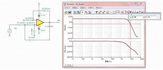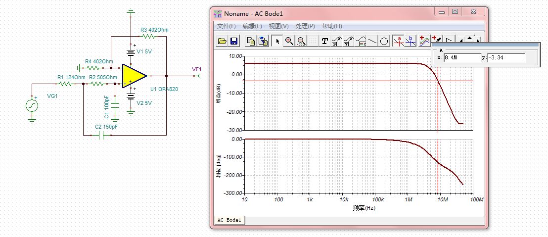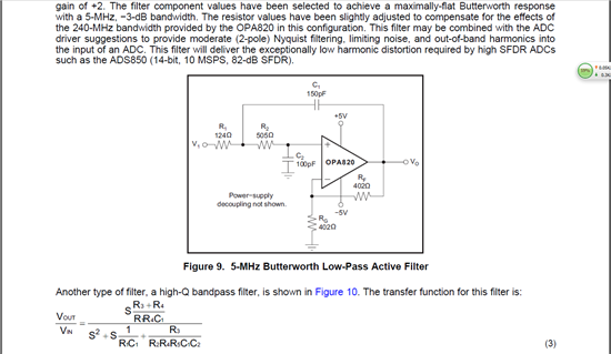 老师们好,我最近用opa820做一个5M的巴特沃斯滤波器,电路图是按照datasheet上给的图搭的: