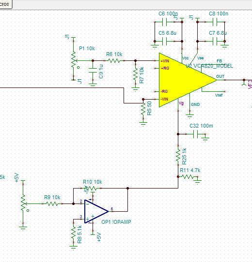 在这里没有使用VCA820,实际上使用的是VCA810,输入信号从左端输入,控制电压通过调节滑动变阻器给出,但控制到-1.35V 左右的时候,就出现自激,肯定是电路问题,望各位在线TI工程师抽出空闲时间帮忙解答下,谢谢