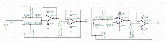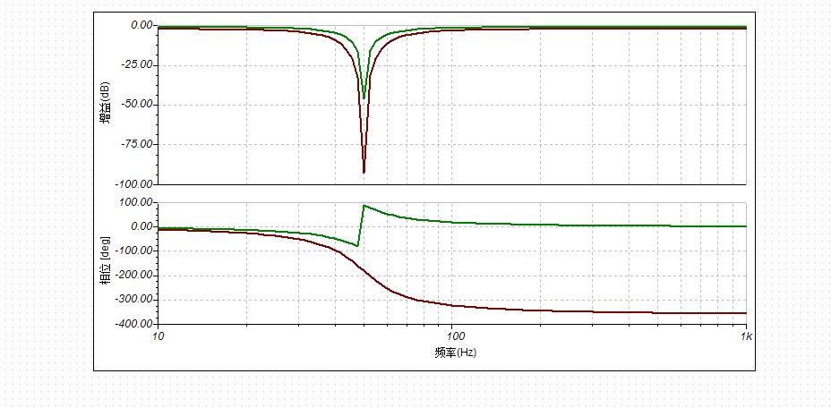 我试着设计了两种陷波器,第一种是普通的双T陷波器,可以看出Q值比较大,但是50Hz处衰减不是很大;另一种就是把两个同样的陷波器级联,可以得到很大的衰减,不过Q值不是很令人满意。。请高人给点意见。