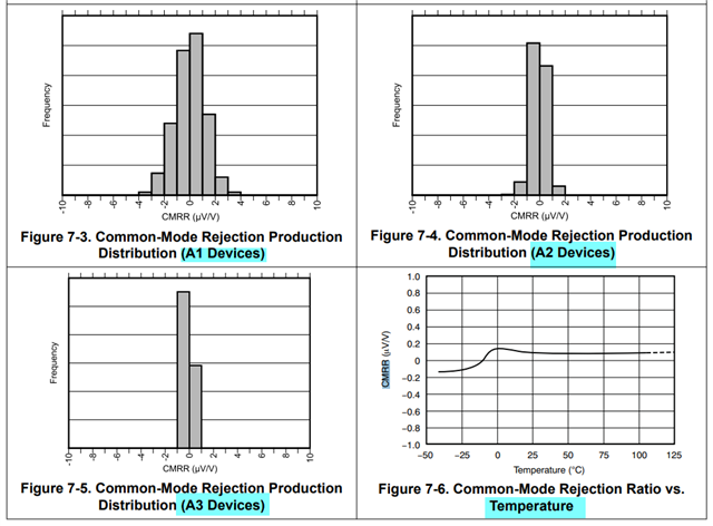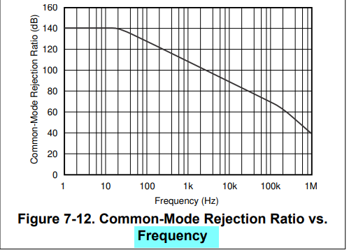 下面手册截图给出了A1\A2\A3产品的共模抑制比分布情况以及温度影响情况;主要考虑的情况是随频率变化造成的影响,看7-12截图,随着共模电压变化频率的增加,CMRR急剧减小;在低频下是140dB,在1MHZ时降到了40dB,因而输出误差增大。