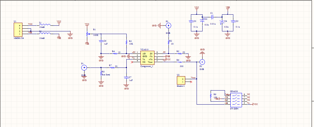 VCA810后接OPA656,应该没问题。不过我拿不准中间要不要端接,你可以看到656手册一些典型应用电路图,输入都是要考虑端接的,而810的手册里输出就没有端接方面的内容。可以试试把R6改成50欧姆,同时在656输入端端接一个50欧姆到地。实际调试时,因为810肯定会有输出阻抗,所以通路上的50欧姆应该是往小调,以达到阻抗匹配。