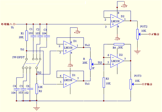前级是是这个移相电路,只是把运放换成op07.后级是用lm393的单限比较器(加偏置的过零比较器)。