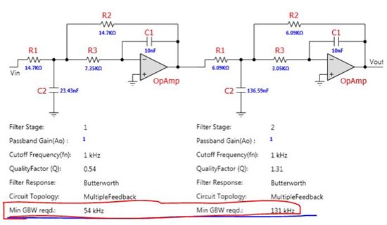 你需要注意的是FilterPro Desktop给出的结果电路图里面,每一阶滤波对当前的运放的带宽都有最小限制。