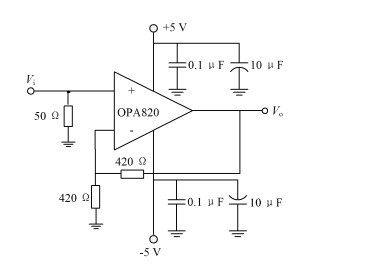 电路你可以参考OPA820的数据手册第13页的Figure 1. Gain of +2, High-Frequency Application and Characterization Circuit