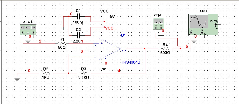 各位老师,又要打扰了,一个简单的运放放大实验,片子是THS4304,电路图中各电阻阻值分别为50 470 4.7k ,先试了个输入频率为20k,Vpp为200mv,接到示波器上图像啥都没有呀,宽带放大器很是捉摸不透示波器上的频率都不对,求各位老师指导