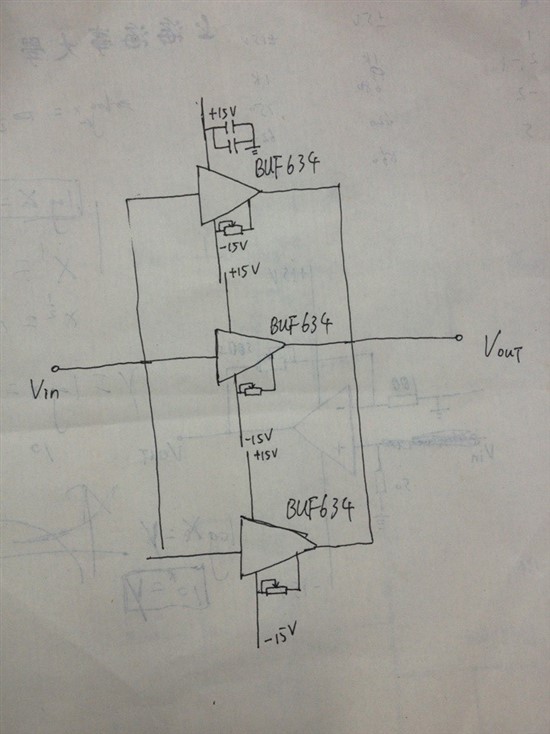 用三个BUF634并联构成一个缓冲器,理论增益为零,现在我的电路增益在-3db左右,输入输出波形都完美,但是输入输出含有较大直流分量,请问专家这算正常现象吗?
