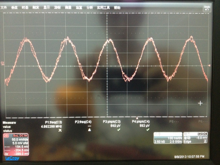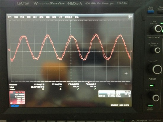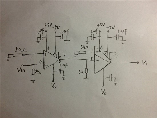 两块VCA810级联,双电源+-5V供电,输入信号为0--10M的20mv正弦波,放大倍数为40db,输出波形为什么如此不完美????请求专家指导