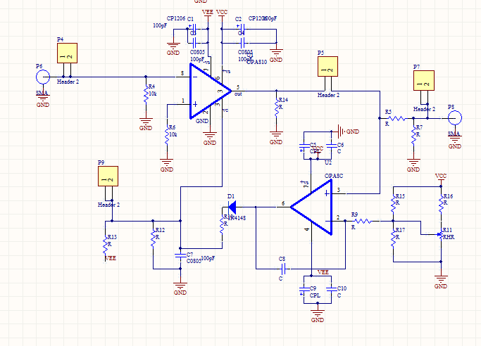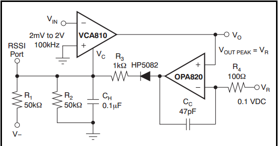 大家好,今天调试VCA810 datasheet中的AGC电路,调了好长时间偶然中才出来结果:示波器1通道接RSSI Port ,示波器2通道接输出,这样的话才能出现结果,现象稳定。。但是把通道1的探头拿掉就没结果了。。。。个人认为是RSSI Port中有电流流不走,聚在VC段使VC的电压为正,使用示波器接上RSSI Port后电流流入示波器,VC段为负,信号放大正常,实现AGC。于是我接了一个1M的电阻在RSSI Port和地之间,但是结果还是不行。。。