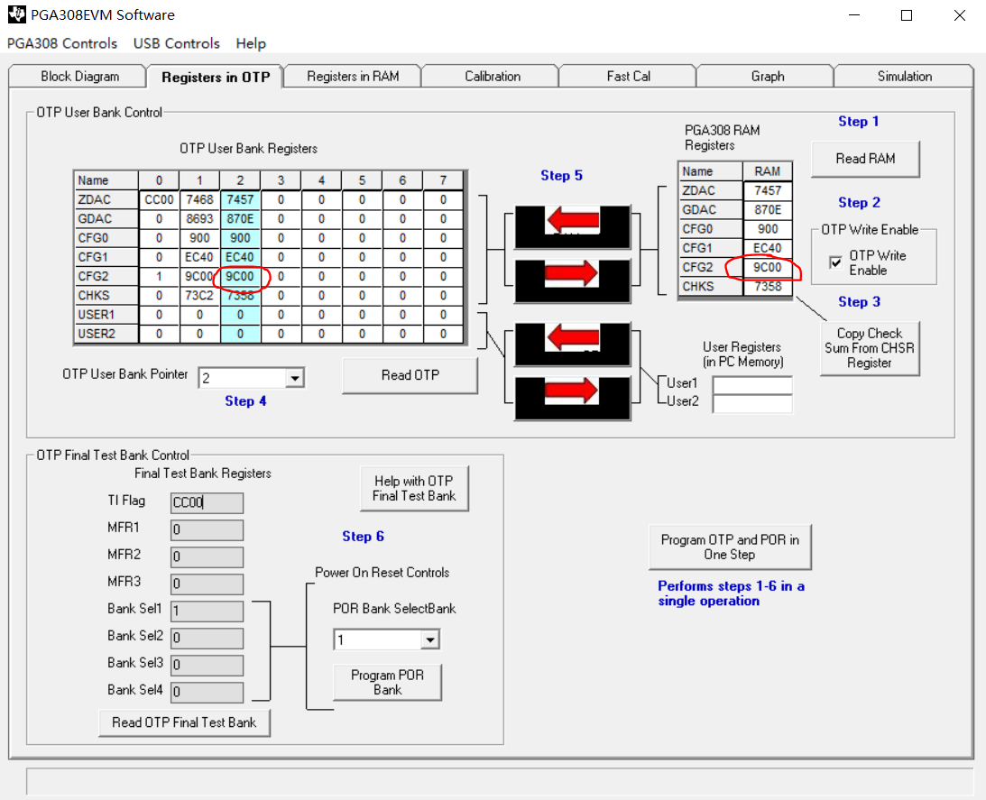 如何单独修改PGA308的某一个寄存器值,我从新操作的时候发现鼠标无法点击并且编辑修改CFG2寄存器,尝试并点击红圈内的窗口但是并不能编辑,请教一下如何修改的详细步骤。谢谢
