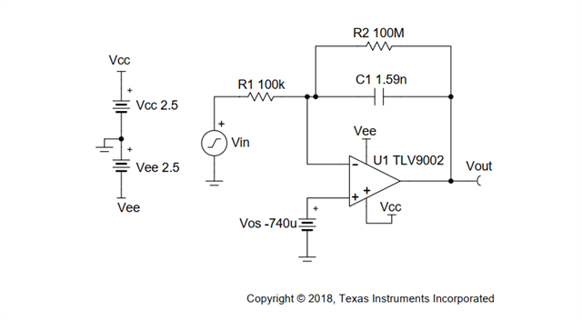 运放的Vos是直流分量,虽然 datasheet给出来典型值,但对于每一个运放来说,它是个不确定的值。因为反馈电阻R2,运放电路有比较大的直流增益,因此输入Vos到输出会有1001倍的增益,如果同向输入端Vos不能完全补偿,不匹配的部分会乘以1001倍的增益到输出端。其实这个R2就是限制低频信号增益的,防止低频信号一直对电容充电导致输出很快饱和。