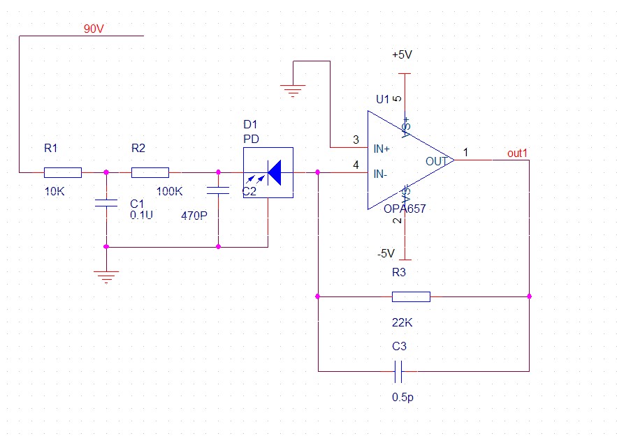 这是我们用TI OPA657做的一个互阻放大器的原理图。