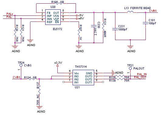 如附件电路所示,使用EL5172将差分PAL信号转换为单端PAL信号,经由THS7314芯片环路输出两路PAL信号。