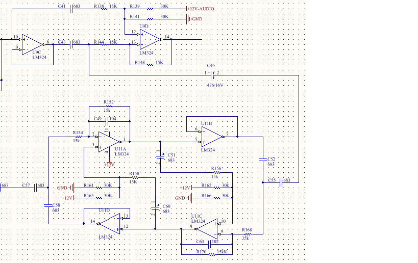 我的电路如附件所示,应用为单线语音传输放大和回声消除,C57到C46之间是传输线路放大,U9C为MIC放大信号的输出,U9D输出接功放,这个电路现在感觉不太对, 我的测试结果如下: C43放到10uF,信号从U9C的10脚输入,C57输出正常,幅度大概下降10mV,但信号从C37输入,R144上测不到波形 C43放到683,信号从U9C的10脚输入,C57输出正常,幅度大概下降一半,信号从C37输入,R144上有波形,幅度下降2/3,但这时候U9C的输出无信号 请帮我看看这个电路,是不是哪里不对?