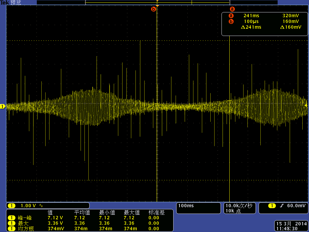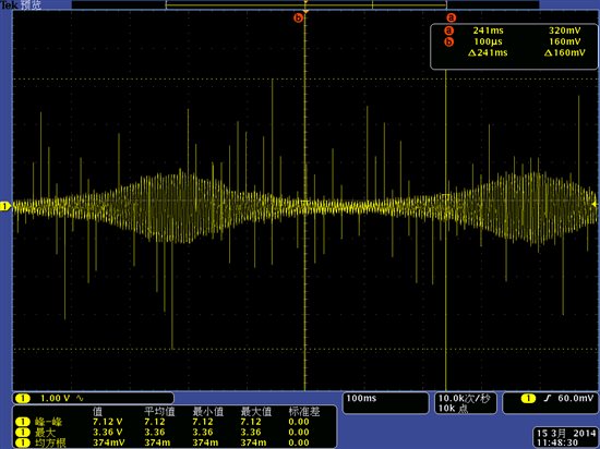 现象三:用示波器直接测试给PCB供电的直流电源,也同样叠加干扰。