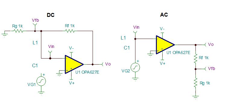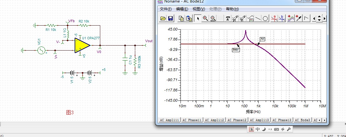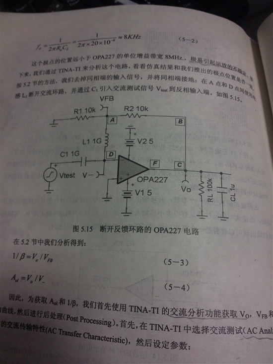我用500Hz 200mvpp 来驱动这个电路,,如图1,结果可想而知不稳定,出现振铃。然后我想分析这个电路不稳定的原因,也就是开环增益Aol中极点的影响,然后对照书上我想到用图2中的方法来分析它的交流传输特性曲线,然后做出Aol=V-/V0和1/β,但是为什么图像如图3那样? 参考了TI书上的讲解,书上出现不稳定现象的是图1中的电路,但是后面在分析时,在画Aol曲线时确用图4的电路图分析,,,为什么用图2中的图不行?