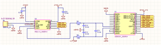 最近使用PGA113做设计,它有两个电源引脚,一个AVDD,一个DVDD,我将DVDD连接3.3V,AVDD连接5v,根据数据手册介绍,输入电平应该由AVCC决定,即最大输出电压应该是5V,但是当给通道1加入4.096V的电压时,输出饱和在DVDD的3.3V电压上,难道输出最大电压是由DVDD决定的吗?另外PGA113能用TINA仿真吗?