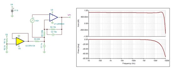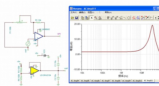 于是仿真了一下,结果如图所示,MHz级以后果然是不平坦的,LHM6643的增益带宽积是130MHz,为什么会出现这种情况呢??