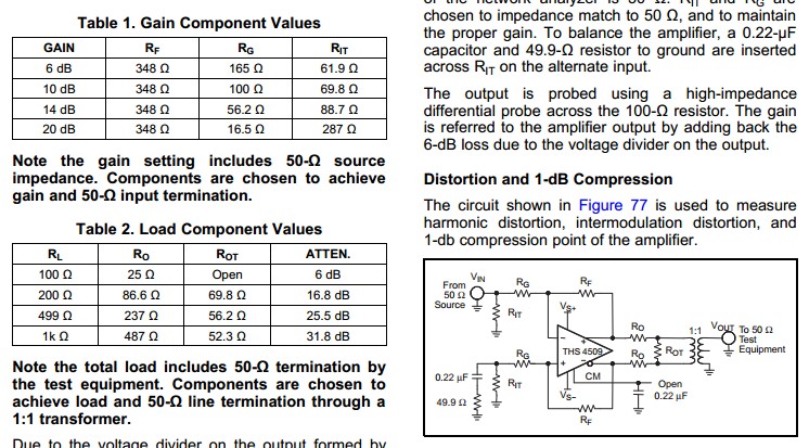 电路见附件,table1是官网给出的不同增益下的50欧姆匹配网络,从表来看,50欧姆阻抗匹配主要靠RG和RIT来匹配,但是datasheet上没有给出相关的公式计算,只有一个计算好的table1。