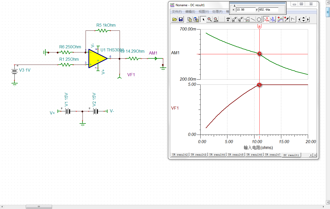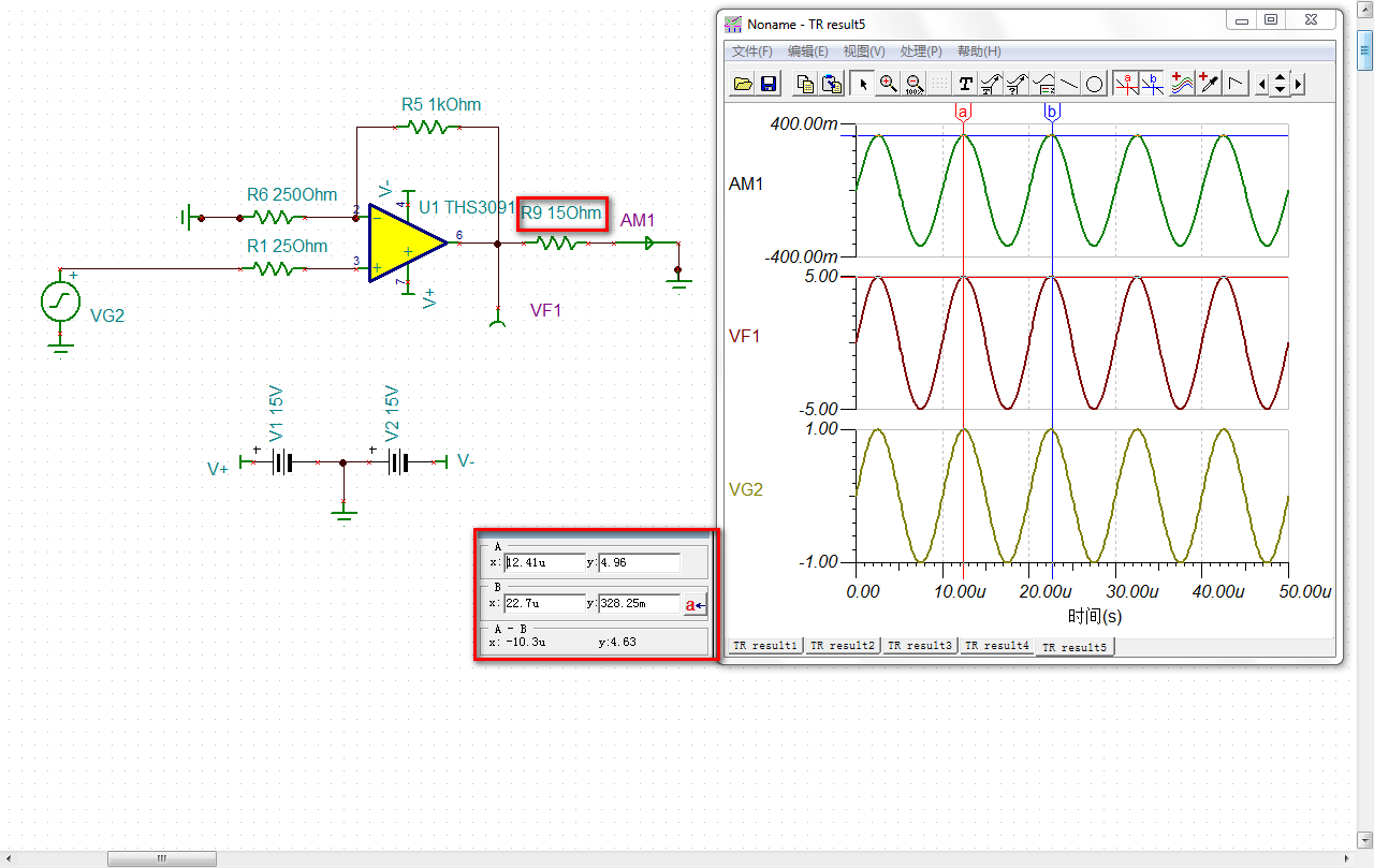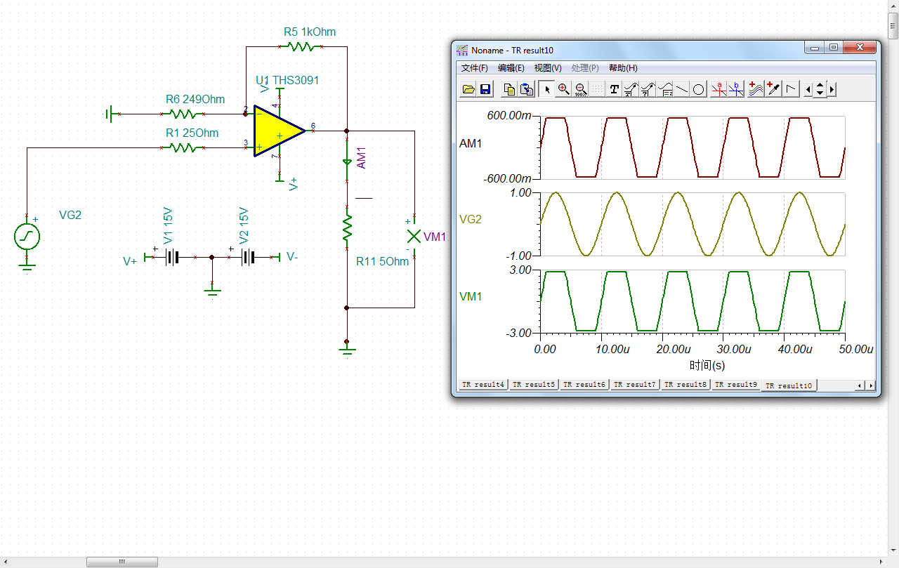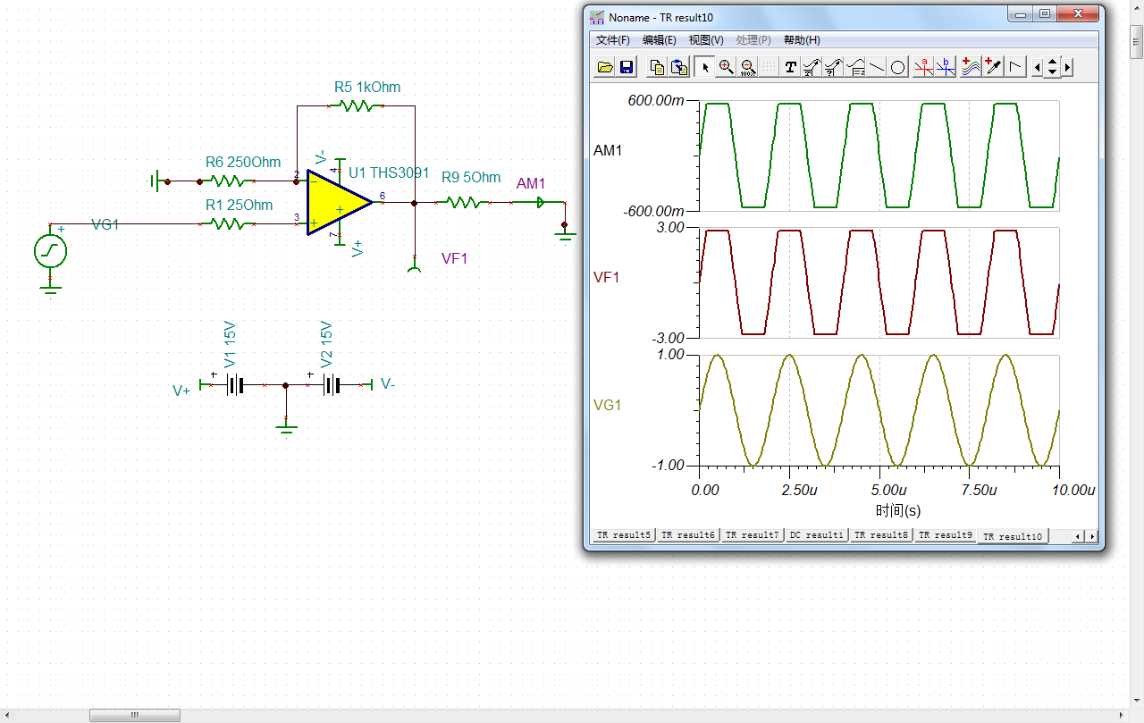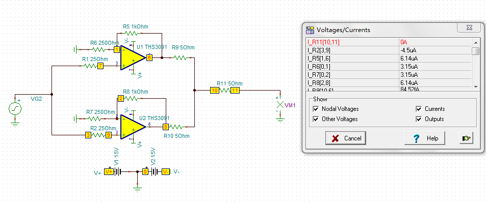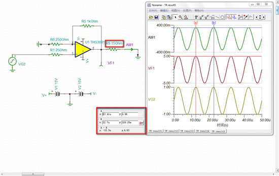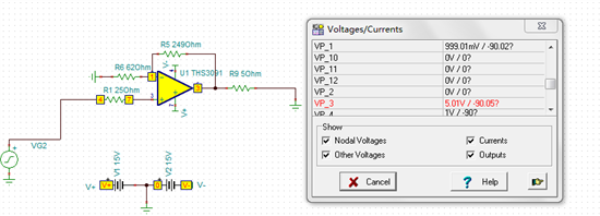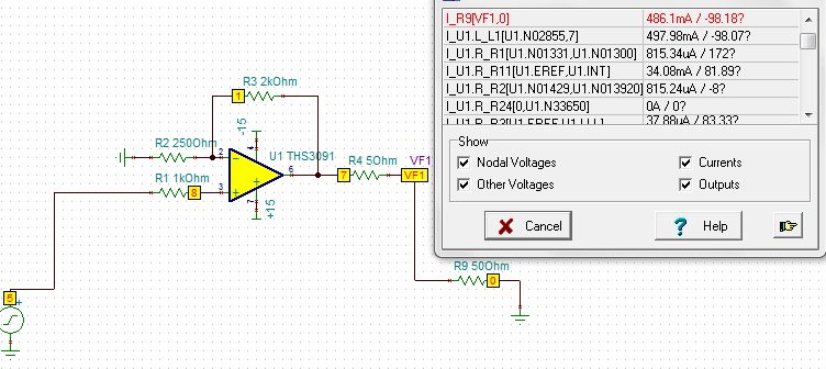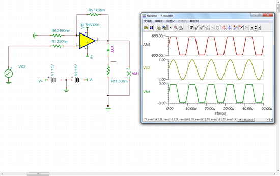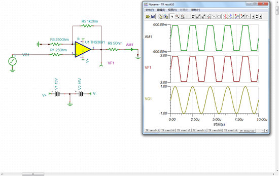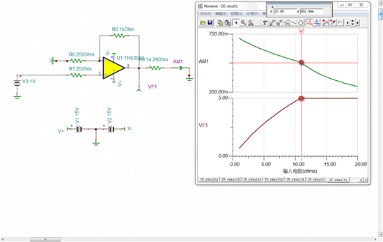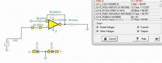 按照芯片手册上电路仿真的THS9031,输出电流为零,是怎么回事?附上电路图和截图