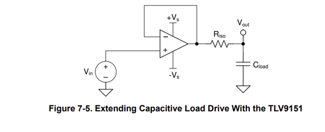 您好,TLV9151适合做跟随器的应用。如果跟随器应用驱动容性负载的话 ,建议输出串联个小电阻作为隔离。参考Figure7-5.