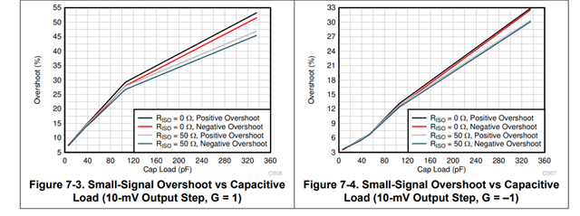 新的设计会将TLV9151作为跟随器(G=1)使用,驱动大容性负载,请问TLV9151是否适合做为跟随器(G=1)使用? 其指标“开环输出阻抗Zo”为525Ω@1M, 当驱动容性负载时,引入的fp=1/2πRoCL会很小,是否会导致输出过冲较大,或输出振荡?