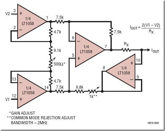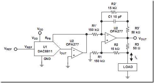 Howland电流源很早之前我就见过,但是当时却不知道这个电压转电流的电路居然还有个名字。最近在DAC8811的数据手册的应用电路部分(数据手册第11页),电路图如下所示: