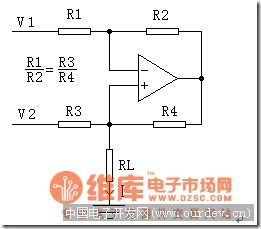 因为R1R4=R2R3,所以可得RL上的电流为-V1/R3。