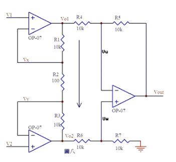 (R1+R2+R3)/R2是定值,此值确定了差值(Vy–Vx)的放大倍数。