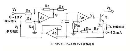 由运放和阻容等元件组成的V/I变换电路,能将0—5V的直流电压信号线性地转换成0-10mA的电流信号,A1是比较器.A3是电压跟随器,构成负反馈回路,输入电压Vi与反馈电压Vf比较,在比较器A1的输出端得到输出电压VL,V1控制运放A1的输出电压V2,从而改变晶体管T1的输出电流IL而输出电流IL又影响反馈电压Vf,达到跟踪输入电压Vi的目的。输出电流IL的大小可通过下式计算:IL=Vf/(Rw+R7),由于负反馈的作用使Vi=Vf,因此IL=Vi/(Rw+R7),当Rw+R7取值为500Ω时,可实现0-5V/0-10mA的V/I转换,如果所选用器件的性能参数比较稳定,运故A1、A2的放大倍数较大,那么这种电路的转换精度,一般能够达到较高的要求。
