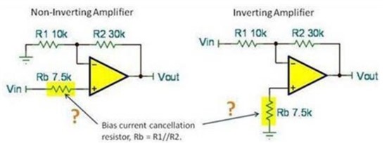 添加 Rb 的目的是降低输入偏置电流引起的电压偏移。如果两个输入都有相同的输入偏置电流,则流过相同电阻的相同电流便会形成大小相等但方向相反的偏移电压。因此,输入偏置电流不会增加电路的偏移电压。这种基本想法在某些情况下有优点。但在添加 Rb 以前,考虑过它的必要性吗? 很多时候,R1 和 R2 并联电阻足够低,而输入偏置电流也足够低,这样在没有 Rb 的情况下形成的电压偏移便微不足道。在添加该电阻器以前,请首先计算这种误差。