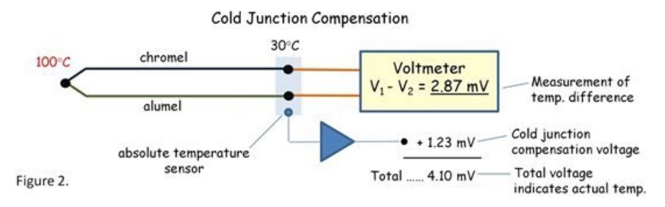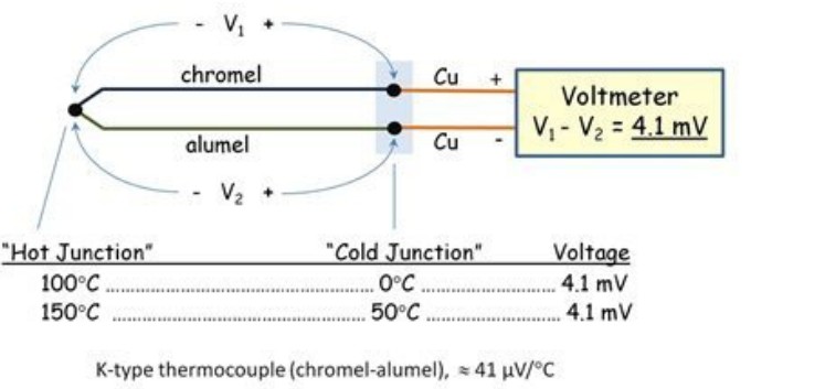 或许有人从来都没有使用过热电耦,热电耦是由两种不同金属制成的温度测量传感器。它们有可能是铜制的或铁制的,也可能是由特殊的金属混合物制成的。不同金属材质的两根导线在一个结点处相连接(这给我们提供了第一个重要的点)——在节点处没有电压,这和您要连接的任何两根导线一样,在连接处不会产生电压。