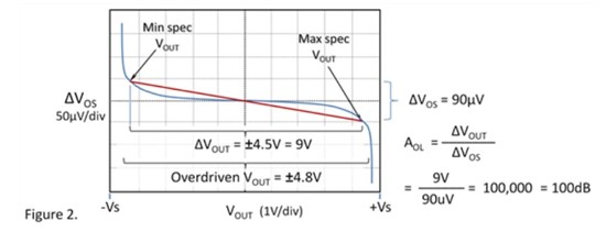 请注意,最大的失调电压变化往往出现在输出极值时,接近正负轨。运算放大器“全力”产生其最大输出。在中间部分,增量开环增益更高,然后下降接近轨附近的输出。正如对电路所做的计划那样,确实是这种情况。当把运算放大器推向其摆动限时,失调电压会更剧烈地上升。并非所有运算放大器制造商对AOL的规定都相同。我们的精密运算放大器经过开环增益测试,在一个较大的输出摆动范围求其平均值,以实现良好的线性运行(图2中红色线条)。