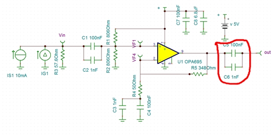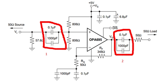 第一部分的电容是隔直作用。datesheet说第二部分的电容也是隔直作用。这里的直流是哪里来的?不是在第一部分就隔掉了吗?我用TI的软件tian90 仿真此图。若加上第二部分的电容如图