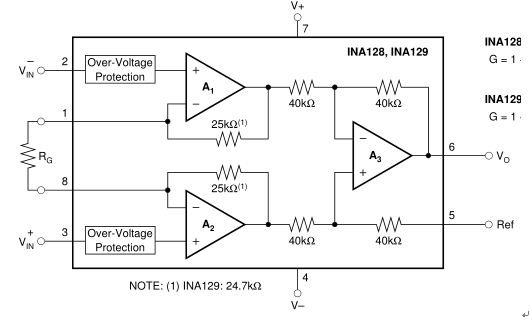 大器则使用与输入端隔离的内部反馈电阻网络。仪表放大器的 2 个差分输入端