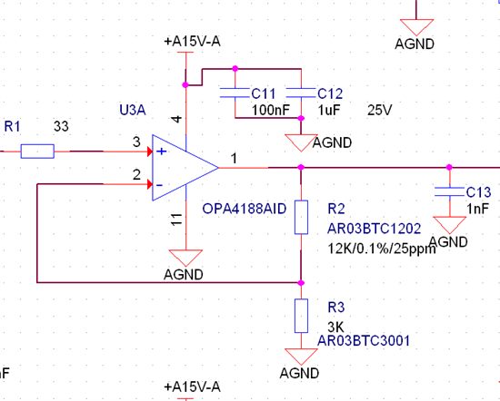 使用OP4188设计为同向比例放大器,原理图如下: