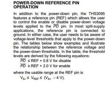 你的理解是对的,因为PD低有效,所以当PD为低电平时,THS3095进入低功耗状态,所以要使正常工作,需要拉高,datasheet规定,PD引脚的电压到大于等于Vref+2V,也就是说如果Vref=0V的话,PD的电压需要大于等于2V才能正常工作。